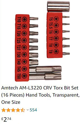 Above: Amtech Torx Bit Set seen on amazon.co.uk April 2021
